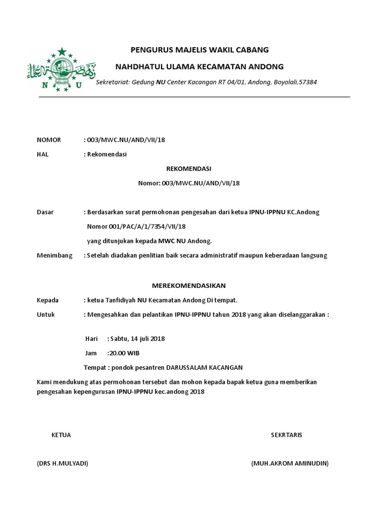 Uncategorized Surat Rekomendasi Nu I p nu desa buaran dengan nomor Surat rekomendasi adalah suatu pimpinan dari suatu perusahaan memberikan surat rekomendasi ini sesuai dengan catatan yang